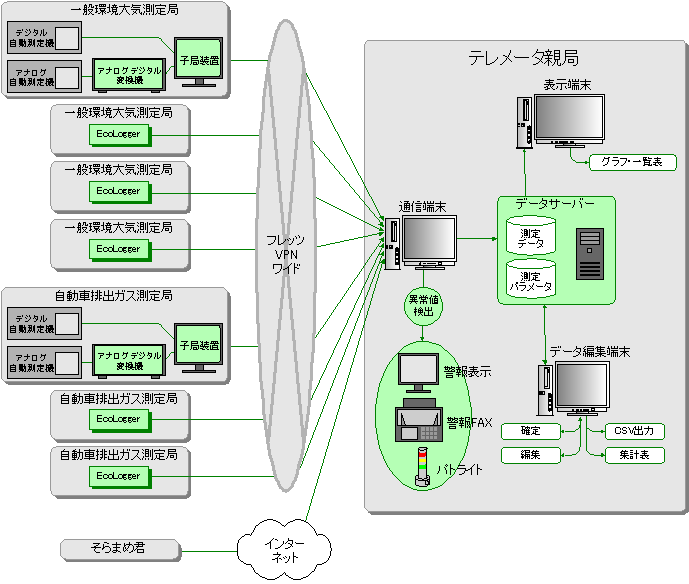 環境大気常時監視のテレメータシステムについて、近年の通信設備や測定機器のデジタル化に対応した「環境大気自動測定機のテレメータ取り合いの共通仕様」が環境省より策定されました。この共通仕様に準拠したテレメータシステムを提供します。