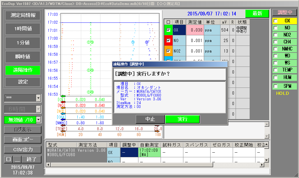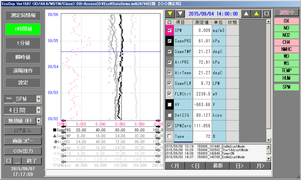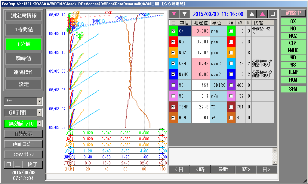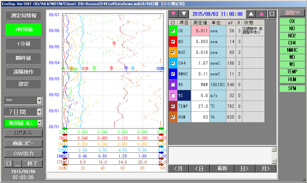 1時間値と精度管理情報を変動グラフにて表示(右下にメッセージ情報を表示)